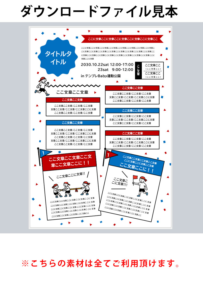 運動会、子供、A3ポスター&チラシ、Word135 商品番号:135 運動会、子供、A3ポスター&チラシ、Word135 在庫状態:在庫有り ¥0(税込) ■このWord無料テンプレートについて ※こちらに入っている素材は利用規約の範囲内でご利用が可能です。 その他 レビュー( 0 ) 再ダウンロード有効期間(日数)無期限 ファイル名135.docx 公開日2030/7/7 バージョン0.1 制作Maruko ログインしてレビューを書く事ができます。 ログインする お客様のレビューをお待ちしています。