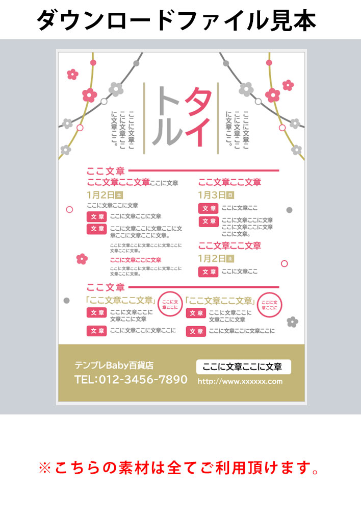 正月、イベント、A3ポスター&チラシ、Word197 商品番号:197 正月、イベント、A3ポスター&チラシ、Word197 在庫状態:在庫有り ¥0(税込) ■このWord無料テンプレートについて ※こちらに入っている素材は利用規約の範囲内でご利用が可能です。 その他 レビュー( 0 ) 再ダウンロード有効期間(日数)無期限 ファイル名197.docx 公開日2030/7/7 バージョン0.1 制作Maruko ログインしてレビューを書く事ができます。 ログインする お客様のレビューをお待ちしています。