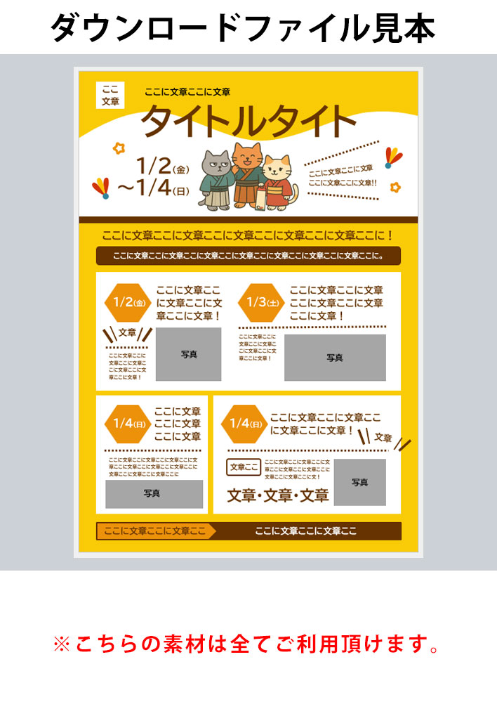正月、イベント、A3ポスター&チラシ、Word203 商品番号:203 正月、イベント、A3ポスター&チラシ、Word203 在庫状態:在庫有り ¥0(税込) ■このWord無料テンプレートについて ※こちらに入っている素材は利用規約の範囲内でご利用が可能です。 その他 レビュー( 0 ) 再ダウンロード有効期間(日数)無期限 ファイル名203.docx 公開日2030/7/7 バージョン0.1 制作Maruko ログインしてレビューを書く事ができます。 ログインする お客様のレビューをお待ちしています。