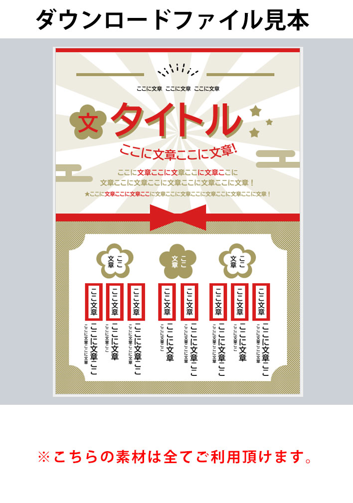 正月、イベント、A3ポスター&チラシ、Word205 商品番号:205 正月、イベント、A3ポスター&チラシ、Word205 在庫状態:在庫有り ¥0(税込) ■このWord無料テンプレートについて ※こちらに入っている素材は利用規約の範囲内でご利用が可能です。 その他 レビュー( 0 ) 再ダウンロード有効期間(日数)無期限 ファイル名205.docx. 公開日2030/7/7 バージョン0.1 制作Maruko ログインしてレビューを書く事ができます。 ログインする お客様のレビューをお待ちしています。