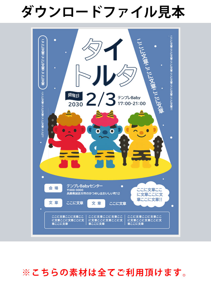 節分、イベント、A3ポスター&チラシ、Word235 商品番号:235 節分、イベント、A3ポスター&チラシ、Word235 在庫状態:在庫有り ¥0(税込) ■このWord無料テンプレートについて ※こちらに入っている素材は利用規約の範囲内でご利用が可能です。 その他 レビュー( 0 ) 再ダウンロード有効期間(日数)無期限 ファイル名235.docx 公開日2030/7/7 バージョン0.1 制作Maruko ログインしてレビューを書く事ができます。 ログインする お客様のレビューをお待ちしています。