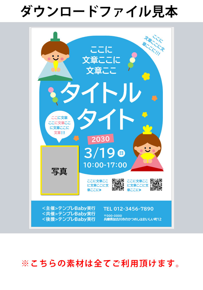 雛祭り、イベント、A3ポスター&チラシ、Word244 商品番号:244 雛祭り、イベント、A3ポスター&チラシ、Word244 在庫状態:在庫有り ¥0(税込) ■このWord無料テンプレートについて ※こちらに入っている素材は利用規約の範囲内でご利用が可能です。 その他 レビュー( 0 ) 再ダウンロード有効期間(日数)無期限 ファイル名244.docx 公開日2030/7/7 バージョン0.1 制作Maruko ログインしてレビューを書く事ができます。 ログインする お客様のレビューをお待ちしています。