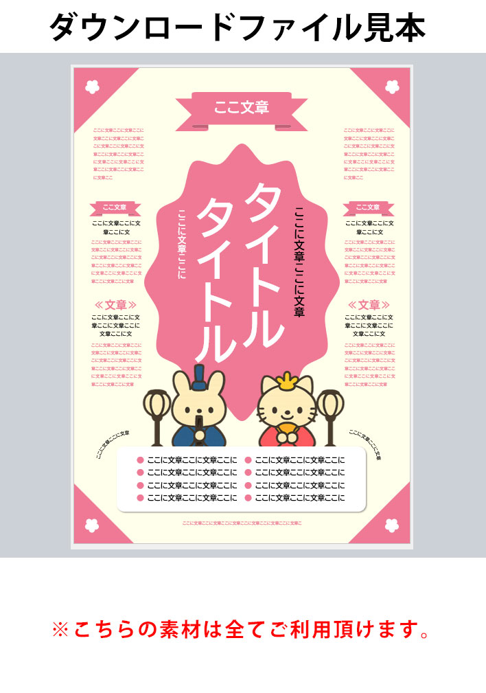 雛祭り、イベント、A3ポスター&チラシ、Word255 商品番号:255 雛祭り、イベント、A3ポスター&チラシ、Word255 在庫状態:在庫有り ¥0(税込) ■このWord無料テンプレートについて ※こちらに入っている素材は利用規約の範囲内でご利用が可能です。 その他 レビュー( 0 ) 再ダウンロード有効期間(日数)無期限 ファイル名255.docx 公開日2030/7/7 バージョン0.1 制作Maruko ログインしてレビューを書く事ができます。 ログインする お客様のレビューをお待ちしています。