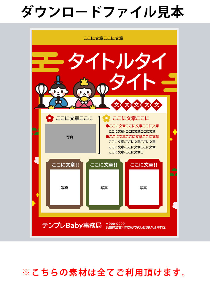 雛祭り、イベント、A3ポスター&チラシ、Word256 商品番号:256 雛祭り、イベント、A3ポスター&チラシ、Word256 在庫状態:在庫有り ¥0(税込) ■このWord無料テンプレートについて ※こちらに入っている素材は利用規約の範囲内でご利用が可能です。 その他 レビュー( 0 ) 再ダウンロード有効期間(日数)無期限 ファイル名256.docx 公開日2030/7/7 バージョン0.1 制作Maruko ログインしてレビューを書く事ができます。 ログインする お客様のレビューをお待ちしています。