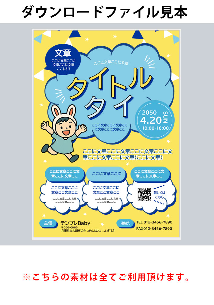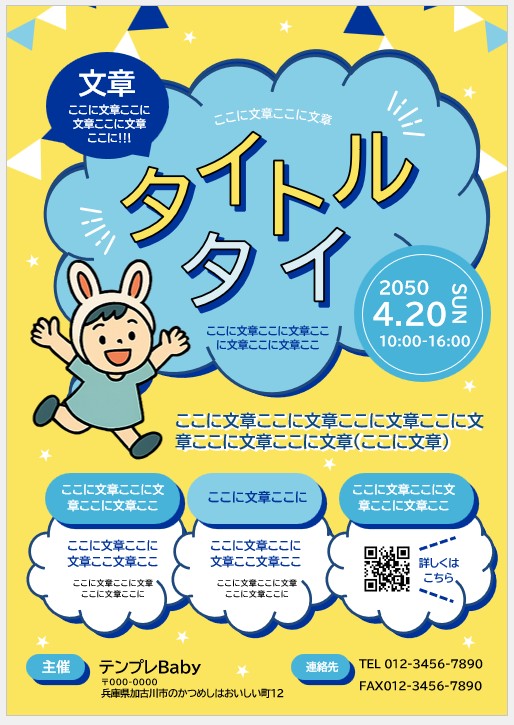 子供、イベント、A3ポスター&チラシ、Word270 商品番号:270 子供、イベント、A3ポスター&チラシ、Word270 在庫状態:在庫有り ¥0(税込) ■このWord無料テンプレートについて ※こちらに入っている素材は利用規約の範囲内でご利用が可能です。 その他 レビュー( 0 ) 再ダウンロード有効期間(日数)無期限 ファイル名270.docx 公開日2030/7/7 バージョン0.1 制作Maruko ログインしてレビューを書く事ができます。 ログインする お客様のレビューをお待ちしています。